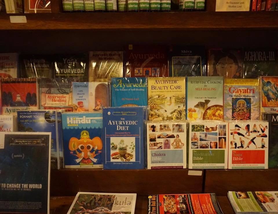 ジャングルの中に6つもスタジオを持ち、ショップにはアーユルヴェーダ関係の本がたくさん。