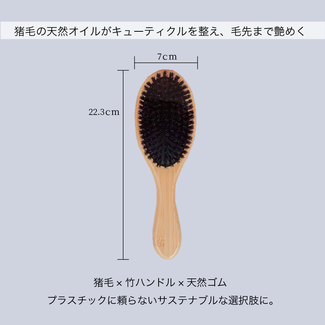 高品質な猪毛を100%採用し、竹と天然ゴムのクッションパッドを使用した、髪にも環境にもやさしいヘアブラシです。